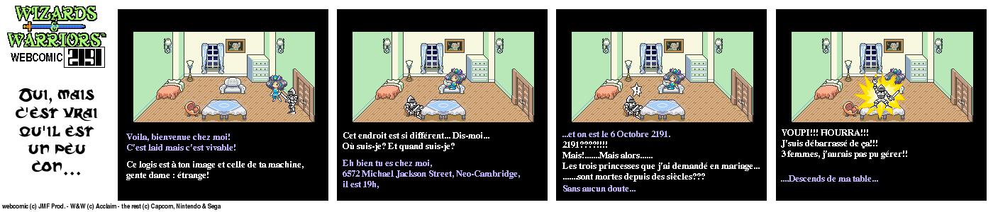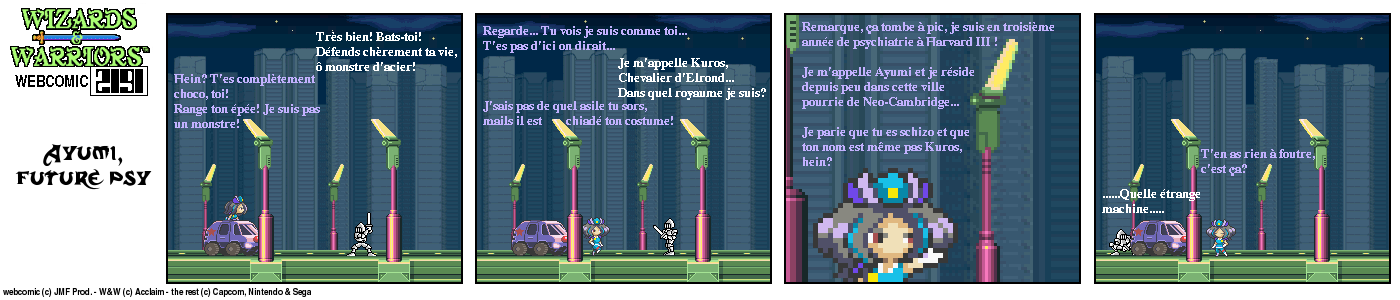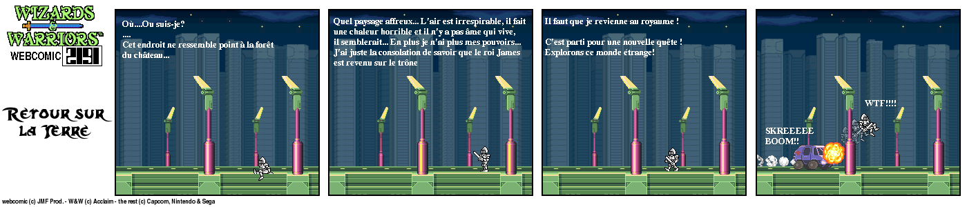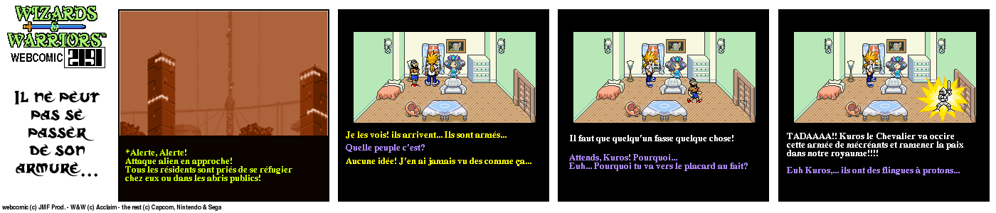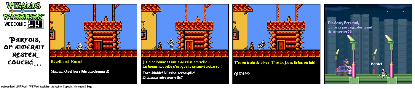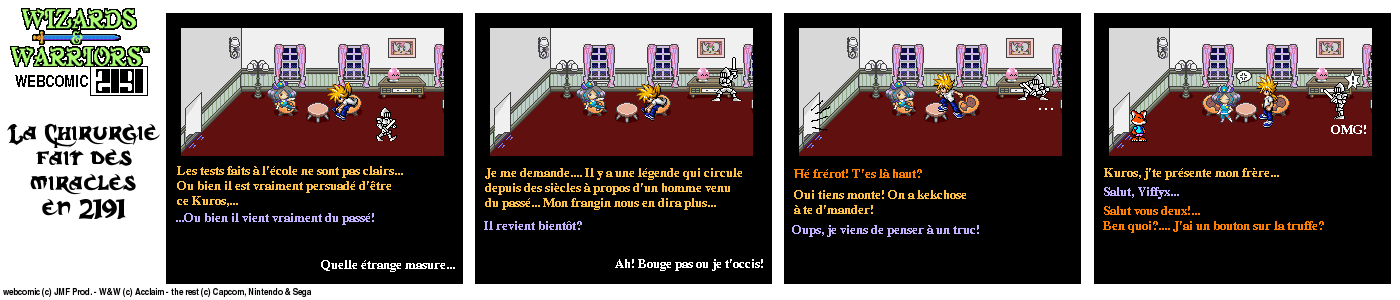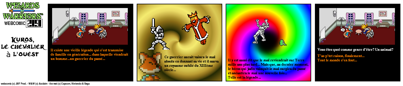 Il y a un bout de temps, en 94, lorsque j’ai fini le jeu Wizards & Warriors 3 sur NES pour la première fois, J’ai été alors très déçu de la fin (pour savoir comment elle est, visionnez le strip d’intro) Le héros part dans le temps et après ??? Après quelques temps, lorsque j’eus Internet, je décidai de voir s’il y avait un Wizards & Warriors 4 où Kuros devrait tenter de survivre en l’an 2191… Rien du tout ! Juste une vague mention d’un Wizards & Warriors Lasersword qui n’a jamais vu le jour. C’est donc à ce moment que j’ai eu l’idée de ce webcomic…