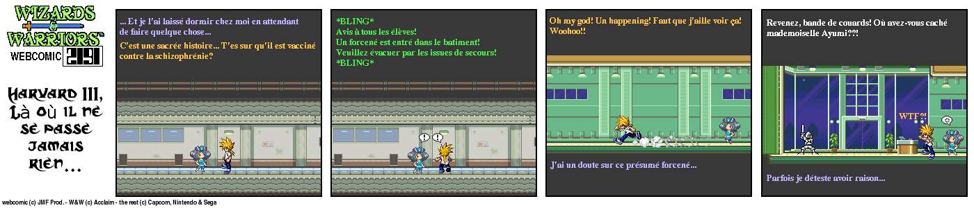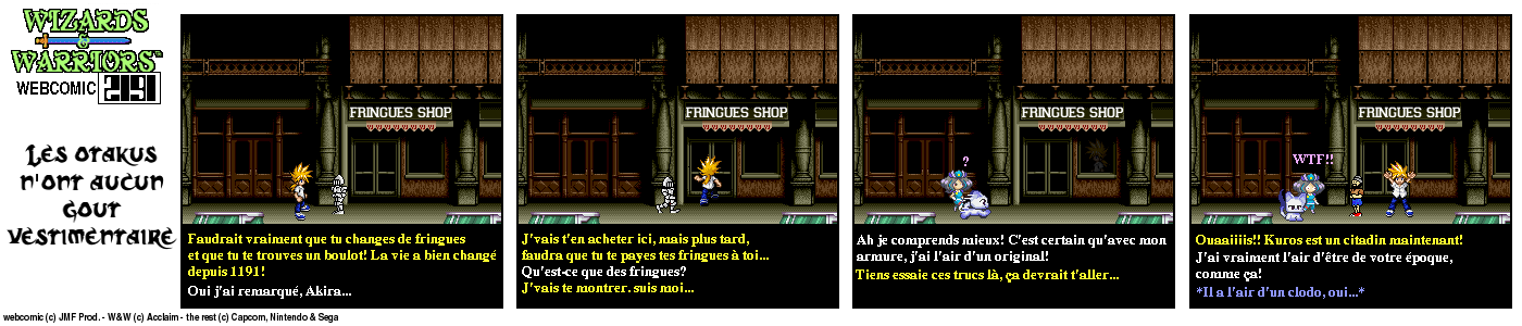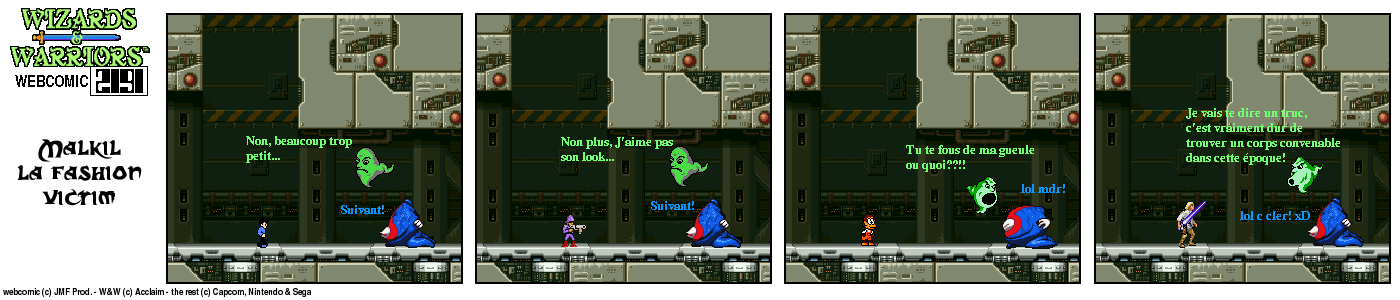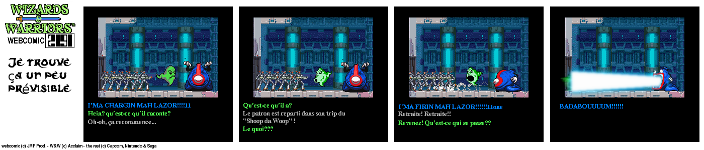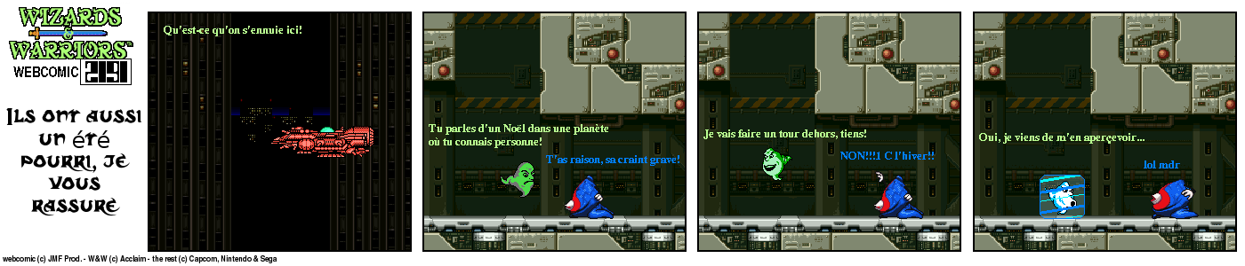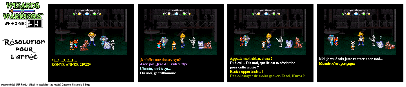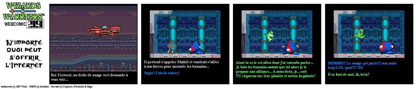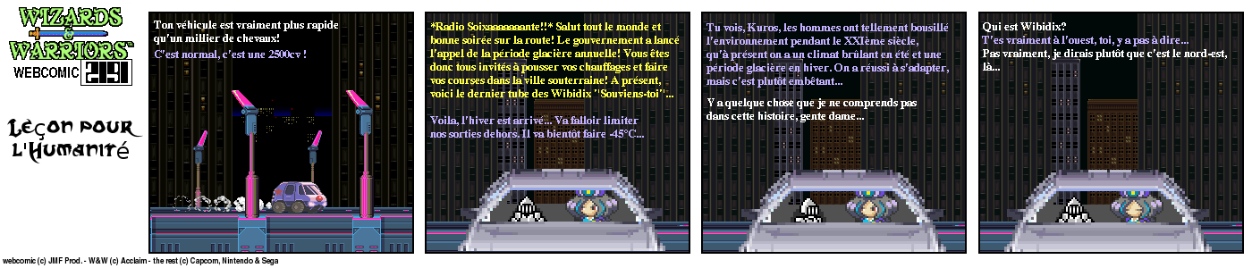 Il y a un bout de temps, en 94, lorsque j’ai fini le jeu Wizards & Warriors 3 sur NES pour la première fois, J’ai été alors très déçu de la fin (pour savoir comment elle est, visionnez le strip d’intro) Le héros part dans le temps et après ??? Après quelques temps, lorsque j’eus Internet, je décidai de voir s’il y avait un Wizards & Warriors 4 où Kuros devrait tenter de survivre en l’an 2191… Rien du tout ! Juste une vague mention d’un Wizards & Warriors Lasersword qui n’a jamais vu le jour. C’est donc à ce moment que j’ai eu l’idée de ce webcomic…